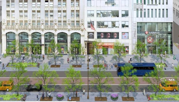 The previously unveiled design calls for doubling the width of sidewalks to 33.5 feet each, expanding unobstructed walking space to 25 feet on each side, and adding another 8.5-foot-wide section for trees with plans for 230 new trees and 20,000 square feet of planters, new seating, and activation space.