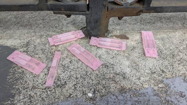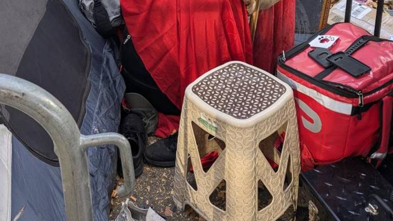 Elsewhere on the park’s perimeter are more discrete signs of the homeless, including cardboard boxes, plastic bags and tarpaulins secreted amid fencing, dirt and benches.