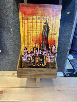 Cascio calls his work “mixed media” and he uses newspaper as a canvas which he then paints New York city scenes on top of. Cascio was quick to note that his work is not any type of political statement, rather he pulls from random news articles and headlines.