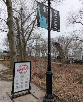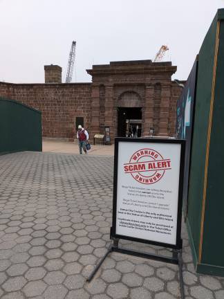 While both SCC and the NPS warn against the scammers online, in lieu of robust enforcement in Battery Park, large signs have been erected with bright red and white stamp-like logo reading WARNING SCAM ALERT. Illegal Ticket Vendors are selling deceptive tickets that cannot access the Statue of Liberty OR Ellis Island. Illegal Ticket Vendors cannot “upgrade” Statue of Liberty and Ellis Island tickets!”