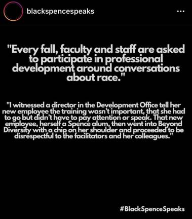 With “BlackSpenceSpeaks,” the account creators call it “an endeavor to expose subtle and overt racism and provide a space for solidarity among students of color.” These graduates and students have also come up with action items for the school to take in order to repair its relationship with Black students and to become an anti-racist institution. The group calls for the school to incorporate more Black history into the curriculum, hire a faculty that better reflects the school and city’s demographics, create an anonymous feedback system for each class so students can feel comfortable to report bias incidents, among several other demands.