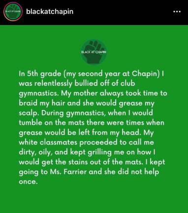 The letter was subsequently signed by hundreds of alumni and students. Agrippa then began sharing testimony from other alums on her personal feed, eventually creating a separate account called “BlackatChapin.”