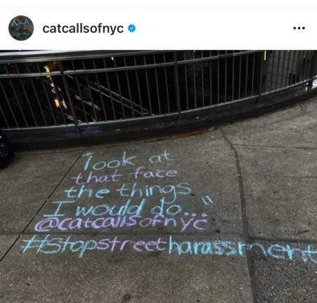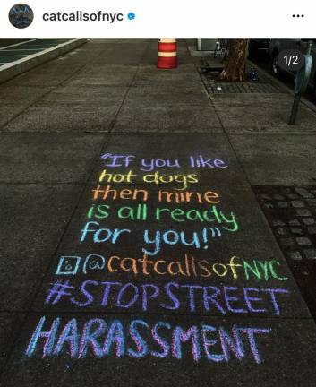“I usually describe Catcalls of NYC as an Instagram account, an initiative that uses chalk art to fight street harassment ... What all the volunteers within Catcalls of NYC do is collect people’s stories of street harassment. We solicit stories via Instagram DM, occasionally also now on TikTok, or even word of mouth,” said Sandberg. “Then we actually go to the locations where people are experiencing street harassment and write down the word-for-word phrases of the harassment on the street with chalk alongside the hashtag #StopStreetHarassment. Then we post it back to Instagram or TikTok.”