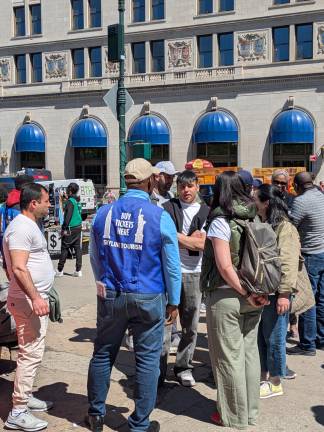 Next came Community Board Chair 1 Tammy Meltzer, one of the undersung, clarion voices of downtown civility and rectitude. Wearing dark glasses, a windbreakers and dark floral-themed blouse, Meltzer took to the podium like an old-time revival preacher, which in some ways, she was the voice on.“The wild west of tour boat ticket selling absolutely can not continue,” she began. “A perfect storm of ineffective regulation and big profits has paved the way for rampant consumer fraud, blocked access to The Battery, and a growing environment of aggression, assaults and even stabbings in the scramble for turf and tourist dollars. The Statue of Liberty is the gateway and a symbol of our country, one that we are blessed to be the steward of and when tourists come to see it they should be met with an inspiring welcome, not illegal coercion, extortion, and fraud. We must hold the tour boat operators accountable for illegal actions (not just the blatantly visible ones) and this legislation is designed to do just that. Thank you to Council Members Marte and Powers for answering our community’s call and taking decisive action to end this chaos.”
