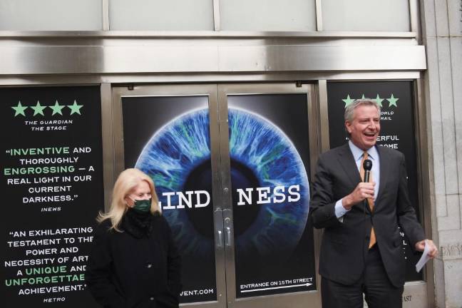 Mayor Bill de Blasio noted on Friday that the city’s cultural community accounted for more than $100 billion in economic activity. He observed this just before curtain time for the first play to open here since the pandemic. The play is “Blindness,” the tale of a community that survives a pandemic. “This is one of the moments that really signals to people our comeback,” the mayor said.