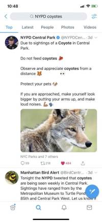 The Manhattan Bird Alert chimed in appreciatively: "We're glad that the NYPD and NYC Parks are encouraging people to accept Central Park coyotes, respect them and coexist with them. They have caused no harm and they link us to the "wild north" - Westchester and the Bronx (!) - whence they come."