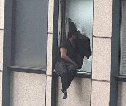 The man, identified in some reports as Ian Mitchell, was reportedly wanted by the FBI to face fraud charges. When the FBI raided his apartment with a warrant for his arrest, he smashed through a window at around 8:40 a.m. and was dangling from a ledge on the 31st floor.