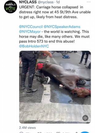 On August 11, NYCLASS tweeted a video of a fallen horse, with the caption: “URGENT: Carriage horse collapsed in distress right now at 45 St/9th Ave unable to get up, likely from heat distress ... This horse may die, like many others. We must pass Intro 573 to end this abuse!” Holden, NYCLASS, VFAR and PETA released a joint statement calling for the horse, named Ryder, to be retired to a certified sanctuary.