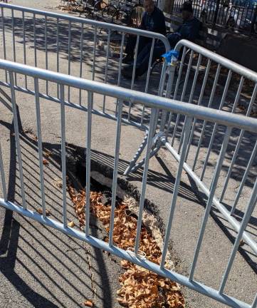 Heading downtown, the Esplanade dies 74th Street, just past and below John Jay Park. A ramp to and from 78th Street, beneath which a fitness area will someday be constructed, gets one to or from the water level. Today, the chief highlight is a sinkhole—yes, a sinkhole—which around which four sections of metal barricades have been lashed to prevent one from falling in—and perhaps falling all the way through to the East River.