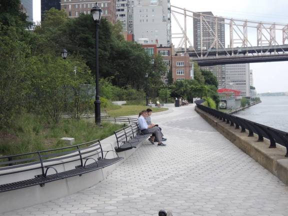 Sitting on one of the benches facing the East River is seductive. The expansive view includes the 59th Street Bridge. There’s a delightful, cool breeze. July 27th, the first day the lock on the construction fence was opened, many parents were guiding small children while others sat on benches reading newspapers or listening to music or podcasts through ear buds.