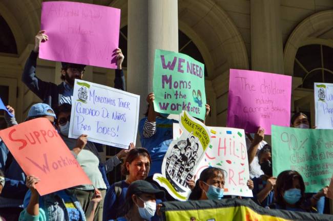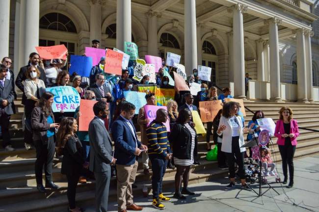 Also speaking at the steps of City Hall, Council Member Alexa Avilés framed child care as a human right. Before the pandemic, the average cost of child care for toddlers rang in at over $16,000 per year in the city, according to a 2019 report from Comptroller Brad Lander’s office. For infants, the cost topped $21,000 per year. “What if you only make $30,000 or $40,000? You now need over half of your income — this is before taxes — for child care,” said New York City Public Advocate Jumaane Williams.