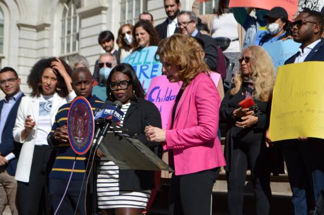 “Today’s unprecedented legislative package will make a huge difference for parents across this city, especially women in the workforce,” City Council Speaker Adrienne Adams said during a rally on the steps of City Hall that morning. New York is now positioned to become the first major city nationwide to enact universal child care, according to Menin’s office.