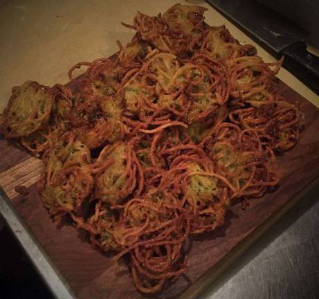 For last year's Art of Food event, Nick Testa, the Penrose's head chef, was paired with Hiroshi Sugimoto's “The Brooklyn Bridge.” The dish he created inspired by the work was a favorite among ticketholders: Smoked Pastrami with Rye Mustard and Pickle Pont Neuf. A ton of thought, creativity, and culinary know-how went into his dish. “There is nothing that encompasses the feeling of New York City better than the Brooklyn Bridge,” explained Testa. “At the forefront of this dish is pastrami, which some may argue is as synonymous with New York as the Brooklyn Bridge. This unctuous smoked and cured meat is something this city has mastered, from Katz's Delicatessen to the local corner deli. Pont neuf, when translated, means “new bridge,” referring to the famous Parisian bridge across the Seine, and is a dish traditionally made with potatoes. The choice to substitute pickles is meant to reflect the briny East River that the Brooklyn Bridge spans.” While we wait to see what Nick creates for The 2018 Art of Food on Feb. 10, Nick is sharing one of his favorite recipes with our readers. Zucchini Pasta Fritters Ingredients 6 c. spaghetti, cooked al dente and chopped slightly into shorter strings 4 bunches scallions, sliced thin 6 small-medium zucchinis, grated 1/2 c. confit garlic 6 eggs 4 c. all purpose flour 1 tbsp. salt 1 tbsp. pepper 2 c. water Method Mix flour,eggs, salt and pepper, and water until smooth. Add onion, spaghetti, and zucchini. Drop large spoonfuls of mixture into well oiled pan. Cook each until golden brown, creating flat, golden fritters Serve with basil-tarragon sauce, or dipping sauce of choice