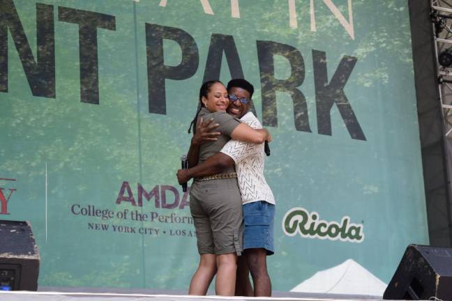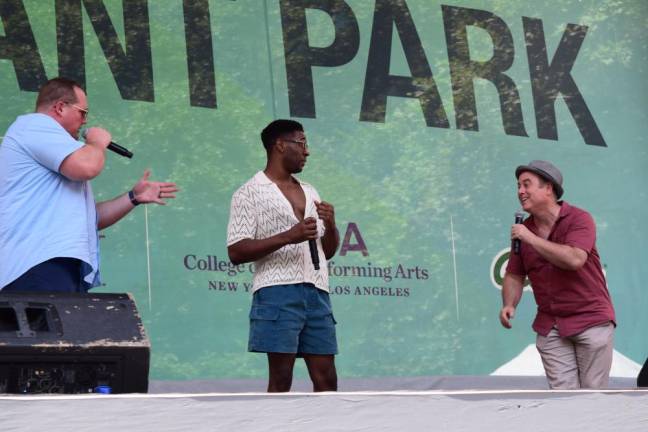 After, Domally returned to the stage, this time accompanied by fellow “The Lion King” cast members Ben Jeffrey (Pumbaa) and Jim Ferris (standby for Timon at Bryant Park). The trio performed the catchy and humorous “Hakuna Matata,” including the song’s various joke-filled interludes. There is a moment in the song when performed on Broadway that sees Timon stop Pumbaa from making a more crass rhyme by telling him, “not in front of the kids.” For Bryant Park, this was changed to “not in front of the lunch crowd in Bryant Park,” much to the audience’s excitement.