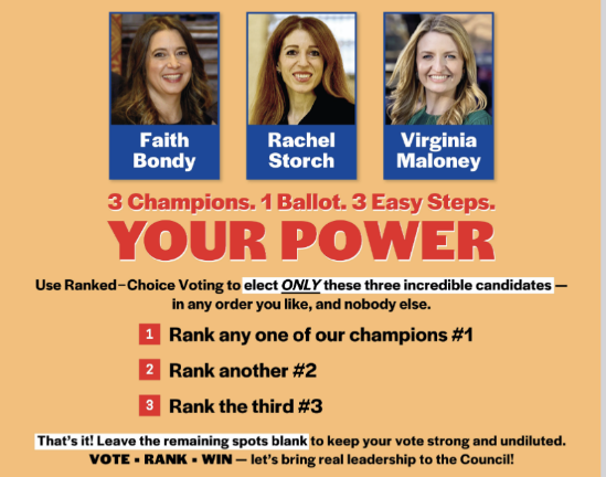 It told voters to rank “ONLY these three incredible candidates”: Faith Bondy, Rachel Storch, and Virginia Maloney. “Leave the remaining spots blank to keep your vote strong and undiluted,” the mailer added. In other words, don’t rank Aronson and Wetzler.