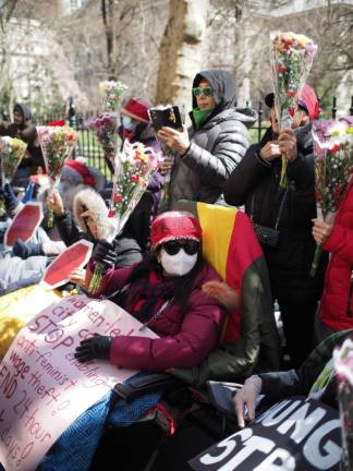 As the rally died down, 68-year-old striker Yayun Li sat quietly in a camping chair. She held a bouquet of pink chrysanthemums in one hand, and a sign that read “hunger strike” in the other. Like the other demonstrators, she was going to go home and rest, she said in Mandarin Chinese. “And then we’ll keep on fighting.”