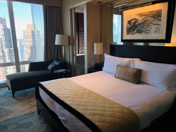 At Columbus Circle, with a lobby 280 feet above Central Park, the views are the bonus to staying in this specific lodging. Should you elect to place your friends or family here, all 198 rooms and 46 suites offer incomparable vistas of either Central Park and the buildings nearby, or the Hudson River. Each room is at least 400 square feet, furniture placement well thought out, and perhaps, a tub with a view! The spa, state-of-the-art fitness center and 75-foot lap pool offer incredible views looking over the West Side, the Hudson and Northern New Jersey’s hills. This hotel, the choice of affluent foreign visitors and C-Suite corporate types, would definitely be a splurge with rates on the basic room category from $800 to $1300, depending on the time of year.