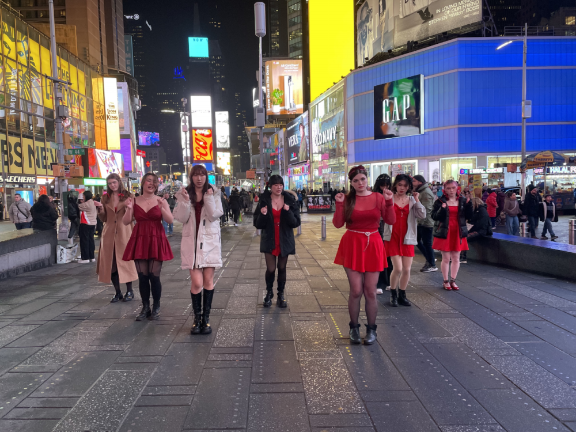 On the performance day, girls’ “Love Bomb” ignited people’s hearts in Times Square on a 35-Fahrenheit night. They wore red dresses with red ribbons on their hair and red heart makeup on their faces. When the music began playing through a huge speaker and the phones started filming, the girls’ status suddenly changed. They were like dancing on a traditional stage: big smiles, energetic dancing movements, and high jumps. Times Square’s LED lights become stage lights and tourists become their audience.