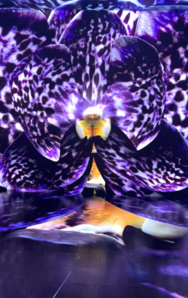 Walking along the pathway, immersive videos of Vanda orchids, cherry blossoms and canary-colored sunflowers envelop the visitor to enhance the feeling of the beauty and serenity of a Korean garden. The videos show florals growing, blooming and fading away in an ever-evolving cycle that has visitors waiting breathlessly for the next wave of beauty.