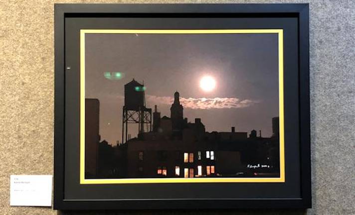 However, I feel that all is forgiven since they accepted two of my works in their 46th annual open exhibit. I was beyond thrilled to win an award for my photograph “Watertower Moon,” which I took the night of the first George Floyd protests in Greenwich Village in May 2020. It was a night of chaos in response to a tragic event. The streets of New York burned, but peace reigned on the rooftops.