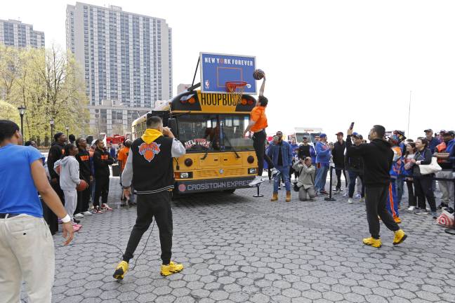 Different activities will be available, including a basketball dunking contest with the Knicks Crosstown Express Bus presented by DoorDash, a vertical jump game, face painting, tote bag giveaways, immersive photo opportunities, and playoff ticket giveaways.