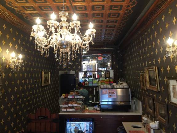 If Dimov’s skill isn’t apparent from the view outside, one can hardly miss it upon entering. A regal chandelier hangs from the gilded ceiling, illuminating the hand-painted, golden fleurs-de-lis spanning the walls, which display restored paintings and original pencil drawings. There is a wooden, L-shaped bench, with two marble top round tables and three chairs for those who wish to linger.