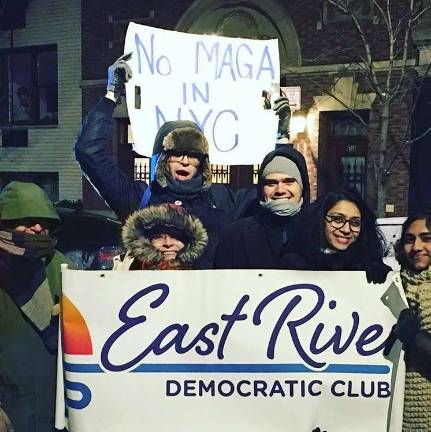 A handful members of the East River Democratic Club braved freezing temperatures to protest the Jan. 30 election outside the Republican clubhouse. Patrick Bobilin, vice president of the East River Democratic Club, said he was disappointed that more demonstrators didn’t turn up, given his view of what the club’s failure to “accept some accountability” for the Proud Boys incident represents.