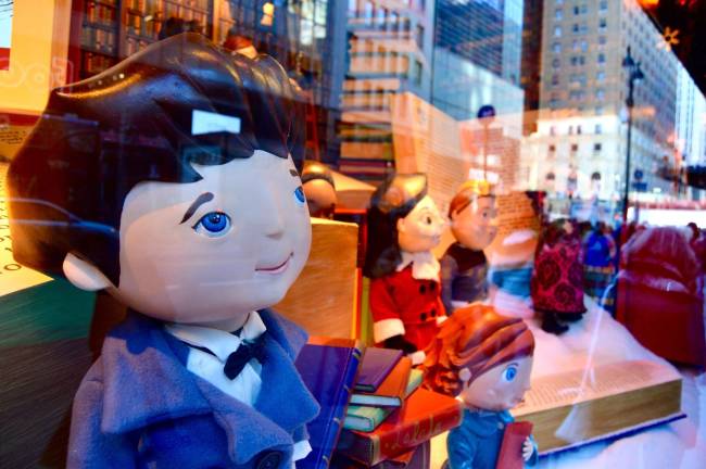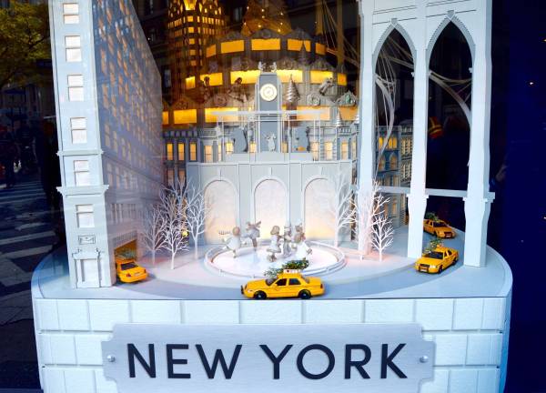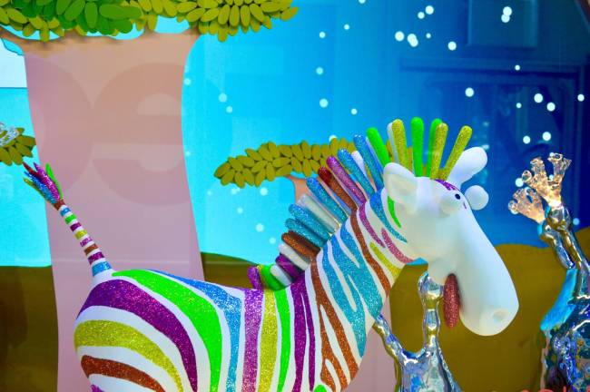 Manhattan’s holiday windows are always a draw, for city dwellers and tourists alike. This year department stores outdid themselves, with themes that focused squarely on the best that NYC has to offer. “To New York With Love,” was the message of Bergdorf Goodman’s opulent displays paying tribute to the New York Philharmonic, the American Museum of Natural History, the New-York Historical Society and other exemplars of the city’s vibrant cultural life. Lord & Taylor emphasized “The Best And The Brightest.” Some focused on city values: harmony at Macy’s (“The Perfect Gift Brings People Together”) and Barneys’ whimsical take on being socially conscious, with a rainbow zebra representing “diversity and acceptance.”