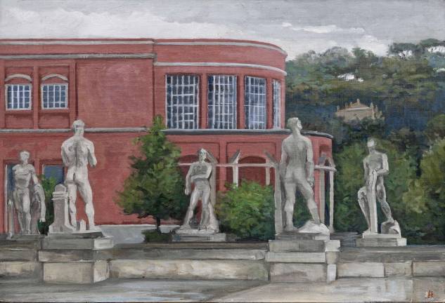 When Pamela Talese traveled to Rome with the intention of painting places where new and old architecture intersect, she didn’t anticipate seeing America’s possible future in Italy’s past. But Talese, who has long captured New York’s outer boroughs, hopped on her bike and found a fascinating visual landscape along the periphery of Rome that is defined, in part, by the history of Fascism. Her latest exhibition, “The Third Rome,” (the title takes its name from Giuseppe Mazzini’s dictum that “After the Rome of the emperors, after the Rome of the Popes, there will come the Rome of the people”) now on display at Robert Simon Fine Art, Inc., on the UES, explores themes of pseudo-populism and fallen heroes in a series of evocative, small-scale oil paintings.