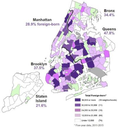 New York City was home to 3.2 million immigrants as of 2015 — 38 percent of the city’s total population — an estimated 750,000 of whom were undocumented. Roughly one million households in the city include at least one undocumented person.