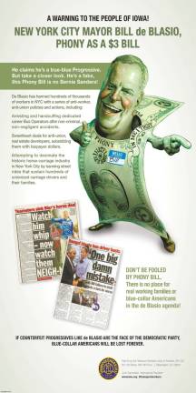 The mayor was greeted by a full-page attack ad in The Des Moines Register, courtesy of NYC-based Transport Workers Union Local 100, which branded him as “phony as a $3 bill.”
