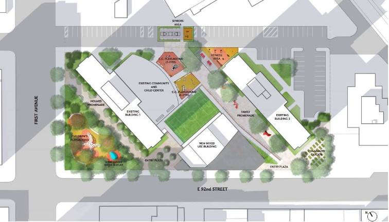 A proposed plan for the site showed new play areas adjacent to the mixed-use tower near the entrance to an existing community center in one of the Holmes Towers buildings, as well as a new playground and walking path near the current site of a small playground near the corner of East 92nd Street and First Avenue.
