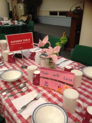 Starting at 4:30 p.m., volunteers busily transform the large, basement-level church hall into a makeshift restaurant. Twenty-five tables are carefully set with tablecloths, cutlery, china dishes, napkins, bread baskets and vases of flowers. Stations for food and drinks are set up along the outside walls, where the volunteer waitstaff, in their matching aprons, can refill their trays.