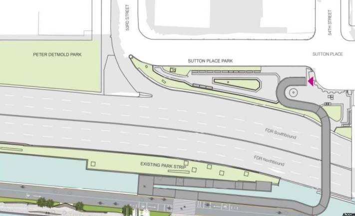 The project also includes the construction of new access points to the esplanade across the FDR Drive. One of the proposed upland connections, a pedestrian bridge at East 54th Street, has aroused opposition from some residents of nearby Sutton Place. As currently planned, the entrance point to the bridge would be within Sutton Place Park South, a block-long strip of shaded open space at the south end of Sutton Place. Some neighbors have complained that the bridge would take up much of the existing park.