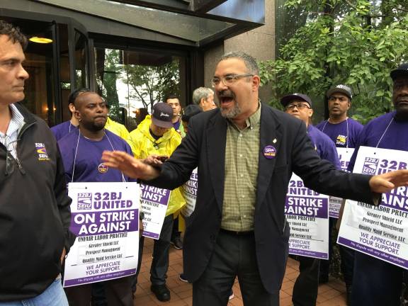Members of 32BJ who work at the building — along with their children, some of the tenants, Manhattan Borough President Gale Brewer and City Council Member Ben Kallos — were there to protest their treatment by Bonjour Capital, which bought the building from Glenwood Management. The strike started last Thursday and ended Monday morning.