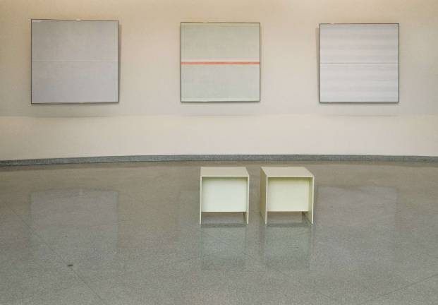 The best place to experience that is in a gallery filled with 12 enormous white canvases, each bearing lines drawn in pencil, one of the humblest of artist’s materials. The lines travel confidently across the plane, yet bear evidence of the human touch. Some are strong, some are wobbly, yet finally all do what Martin intended.