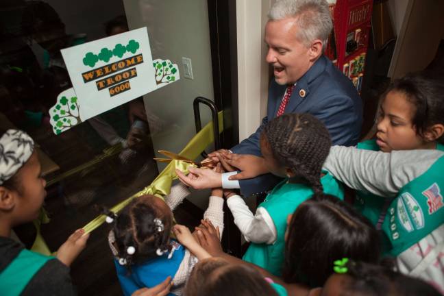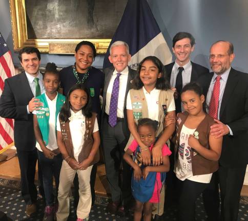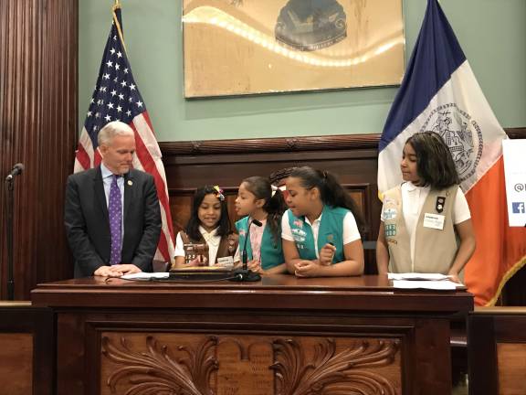 Five girls donning green and brown vests dotted with stitched patches approached the podium in City Hall’s Blue Room last Wednesday. They had an exciting announcement for the news conference: their Girl Scout troop, Troop 6000, the first serving homeless girls and women, will expand far beyond their Queens shelter.