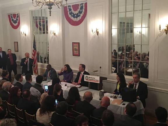 Faulkner, former city police detective Dietl, Staten Island Assembly Member Nicole Malliotakis and real estate executive Paul Massey answered questions at the Metropolitan Club on East 60th Street in front of a packed house of more than 100 people. Cheers abounded at any criticism of de Blasio, who was lambasted by the candidates for protecting immigrants from deportation, failing to fix the homelessness crisis and what they characterized as a bloated city budget.