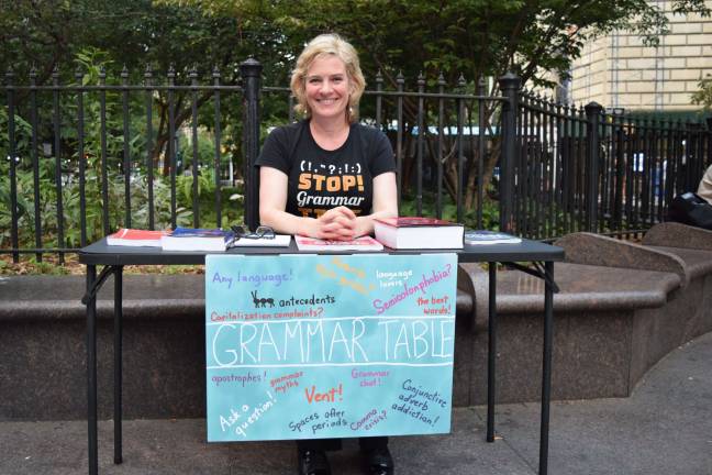 A steady stream of passersby paused in the midst of the rush hour scrum to gaze curiously at the Grammar Table sign. Some were wary; others, perhaps emboldened by the inclusion of “Vent!” in the sign's menu of services, had bones to pick.