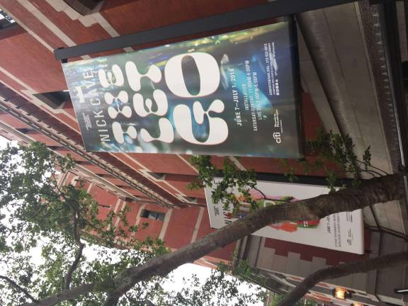 The installation is open on Saturday and Sunday from 11 a.m. to 6 p.m., with DJs spinning from 2 to 6 p.m. Cave’s “Soundsuits,” the work for which he is best known, are on display as sculpture during this time in the ornate rooms located off the main floor hallway, known as the Head House. The soundsuits are elaborately constructed of brightly colored raffia, beads, hair, buttons and other found objects and are displayed as sculpture juxtaposed against the stuffy formality of the room decor.