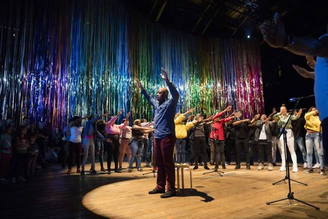 A lot happens next. The piece is at the far end, then it’s moving towards you, then it’s brushing past you, then it surrounds you, then you’re tangled up in it, and when you push through and bat the curtain away you’ll find yourself in one of the six spotlights on the floor. You won’t be alone. Cave began as an Ailey-trained dancer before moving into visual art. There are dancers here performing along with a number of community groups — yoga teachers, school groups and church choirs. The crowd is mixed, everyone from an older man in a wheelchair to preschoolers running and twirling. You can stand there and watch or take your phone out and snap something for the ‘Gram but really, Cave wants you to let go.