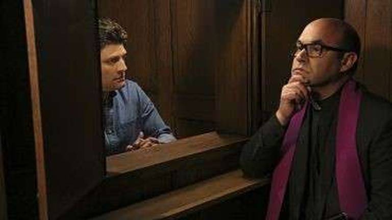 Just as anti-gun activists argue that the Second Amendment was written when people walked around with muskets to protect themselves, their land and their freedom, not to mention that if they wanted dinner they had to shoot it, “Father Gene” (Ian Gomez) explains that times have changed since the Holy Scriptures were penned. When Chip confesses he no longer wants to keep the confidences of a cheating co-worker, the pastor advises that he not choose “stoning” — the Bible’s go-to punishment for those who have extramarital affairs — because nowadays assaulting an officemate with rocks will most likely result in jail time. So Chip persists, working within modern day parameters.