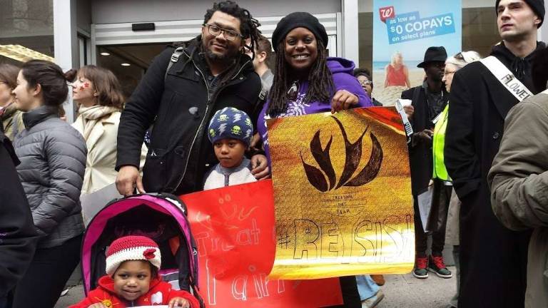 Deva Woodly, a politics professor at the New School who marched with her husband and two young children, said the family was taking part in a show of opposition to the incoming administration.