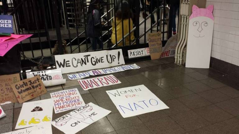 One sign gleefully proclaimed “Tiny hands, tiny feet. All you do is tweet, tweet, tweet!” Another stated “Make America tolerant again.” One was a riff on the Serenity Prayer: “I am no longer accepting things I cannot change. I am changing the things I cannot accept.” Inside the 57th Street subway station on Seventh Avenue, discarded signs were arranged into a display.
