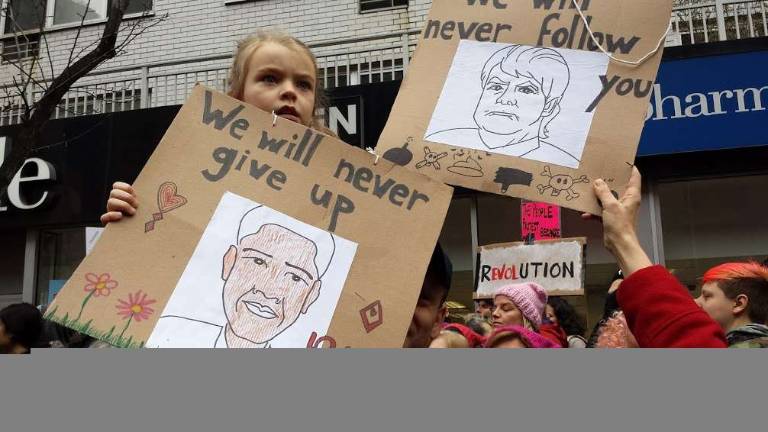 “We're here to show our support for the resistance and for the 65 million folks who did not vote for Mr. Trump. I'm here to stand up for civil rights. The whole idea of liberty is in jeopardy. It's up to the people now — we're the last check. My kids will need to keep fighting,” Woodly said. “I found his inauguration speech highly disturbing. In short, Mr. Trump lacks empathy.”