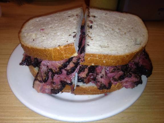 When Carnegie the Deli met Trump the food court — The buzz was, after the Carnegie Deli closed its doors forever, that only Madison Square Garden was selling Carnegie Deli pastrami. And Noah Remnick’s recent New YOrk Times article, “Where the Carnegie Deli Yet Lives, on Certain Nights,” reported on the fate of the famous deli’s pastrami. Well, Noah, you missed the hot table at Trump Tower food court in the atrium where the printed menu on the counter explicitly says, “Carnegie Deli Pastrami.” Somewhat surprised, I inquired of the counter staff — they actually sent out the chef — about their carrying Carnegie Deli pastrami. They couldn’t confirm or deny, but “if that’s what it says, then that’s what it says,” they assured me. The chef was a little more Trump-savvy by suggesting that maybe Trump’s butcher was the same as Carnegie’s. Good try, Chef. Maybe. At the end of the day, I can see Trump ads promoting the pastrami by saying that MSG’s not the only NYC seller of the Carnegie Deli brand. And that pastrami at Trump doesn’t have MSG. There you go.