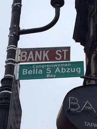 On March 29, Bank Street off Greenwich Avenue, a few doors away from the Greenwich Village home where she had lived from the 1960s through the 1980s, was officially co-named Congresswoman Bella S Abzug Way.