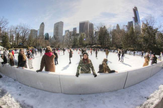 Wollman lies on a valley as you enter from Central Park South. In a few minutes you descend and the whiteness of the ice appears and then the wooden enclosures with all the amenities you need for a happy time — shoe rentals, food court, lockers and benches.