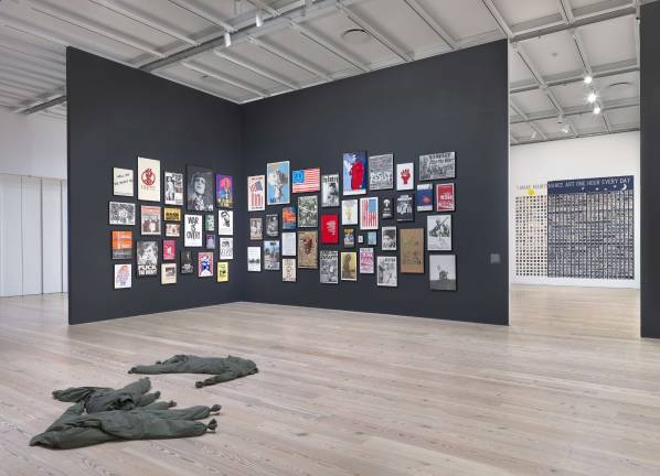 The protest art of the past also informs the aesthetics of the present. A massive wall covered with protest posters from the Vietnam ear — “End the Draft,” “Stop the War,” “Resist” — is reminiscent of the barrage of memes and hash-tagged terms in the endless scroll of social media.