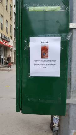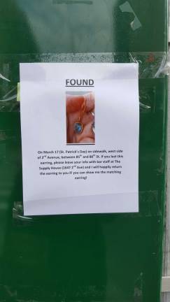 Of course, there was no guarantee that she was a Supply House patron, and so Sternberg photographed the earring and taped multiple fliers to all the lampposts on a two-block stretch of Second Avenue between 84th and 86th Streets. Inevitably, some have already been torn down; others are still standing.